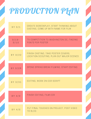 To the right is the ideal schedule I would like to stick by since it would allow me to take my time with the project. The schedule might be hard to keep up with around the beginning of March since March 4th is my SAT and the 10-15th I will be in Washington DC.